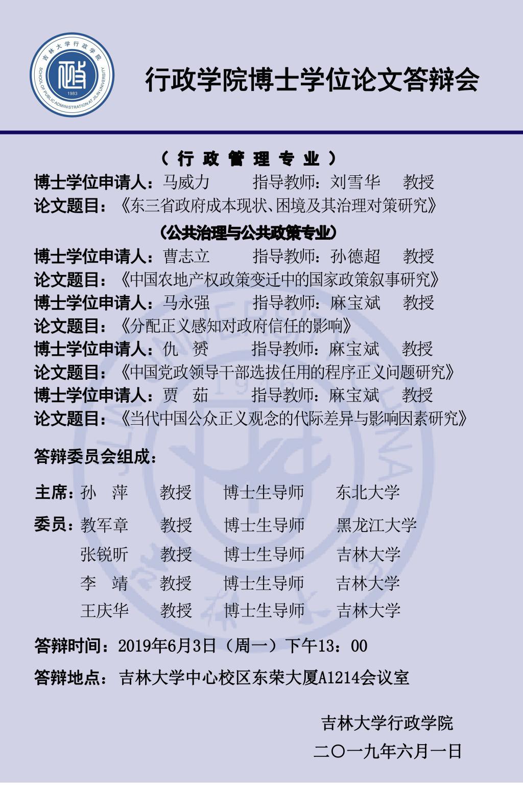 答辩学生:马威力、曹志立、马永强、仇赟、贾茹(答辩顺序以导师姓氏笔画为序,同一导师名下学生按姓氏笔画为序)